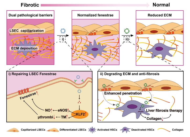组织纤维化是由于器官受损引发过度自愈反应,是组织内细胞外基质异常增多和过度沉积的病理过程。纤维结缔组织增生会导致实质细胞减少,持续进展可导致器官结构坏死和功能减退,乃至衰竭,严重威胁人类生命健康。针对肝纤维化病理条件下毛细血管化的肝窦和沉积的细胞外基质阻碍药物蓄积、成纤维细胞过度活化的特点,该团队构建双纳米穿透剂调节肝窦内皮细胞,恢复肝窦窗孔,消融过度生成的细胞外基质并使活化的成纤维细胞转变为静息态,最终成功逆转肝纤维化病理微环境,实现有效治疗。相关研究以“Sequential nano-penetrators of capillarized liver sinusoids and extracellular matrix barriers for liver fibrosis therapy“为题发表在ACS Nano上。我校硕士生张凌烽、王兴欢及硕士毕业生张程璐为共同第一作者,1818luck新利网址为本文的第一通讯单位。(全文链接:https://pubs.acs.org/doi/10.1021/acsnano.2c03858)