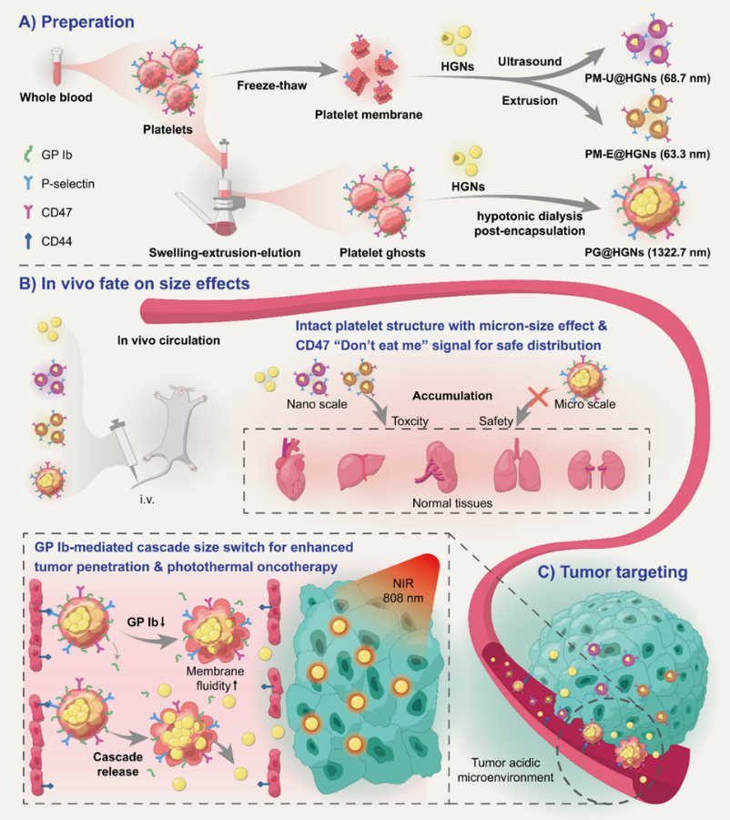 基于对肿瘤EPR效应的关注,团队针对纳米尺寸药物易从血管内皮间隙外渗而导致脱靶并在正常组织蓄积的难题,设计了微米级血小板“鬼影”(PGs)载体递送中空金纳米粒(HGNs),构建了有较高安全性的微-纳级联仿生递药系统(PG@HGNs)。相比纳米血小板膜包覆载体,PG@HGNs的细胞摄取和细胞毒性显著增强。相关内容以 “Glycoprotein Ib-regulated micro platelet ghost for biosafe distribution and photothermal oncotherapy”为题发表在Journal of Controlled Release。我校2019级硕士研究生邹佳辉为本文第一作者,张文丽副教授、刘建平教授为共同通讯作者,1818luck新利网址为唯一通讯单位。