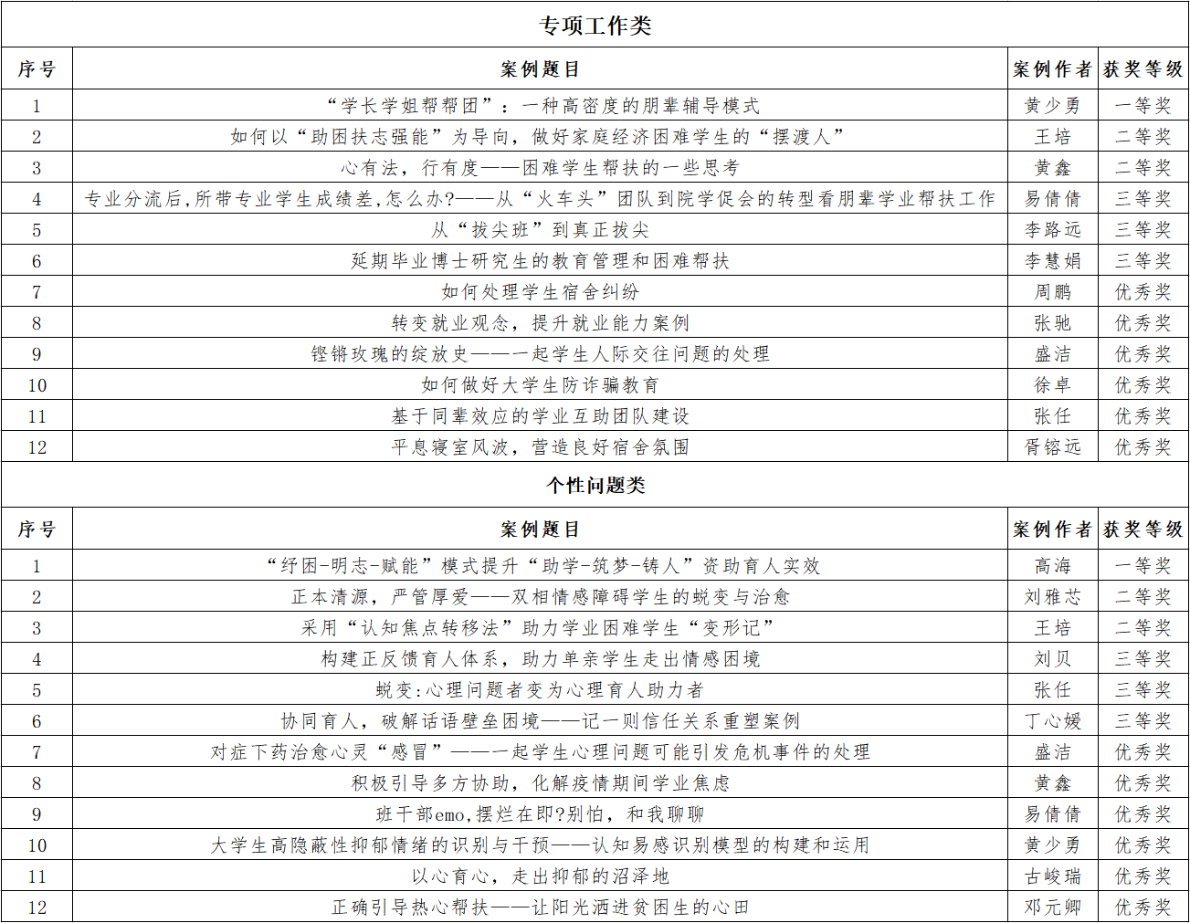 为加强学工队伍建设,凝聚学院学生工作特色,创新药学人才培养机制,更好开展大学生思想政治教育,新利备用官网开展2022年学生工作典型案例评比活动。经校内外专家评审,个性问题和专项工作各评出一等奖1名,二等奖2名,三等奖3名,优秀奖6名。现将评选结果公示如下:
