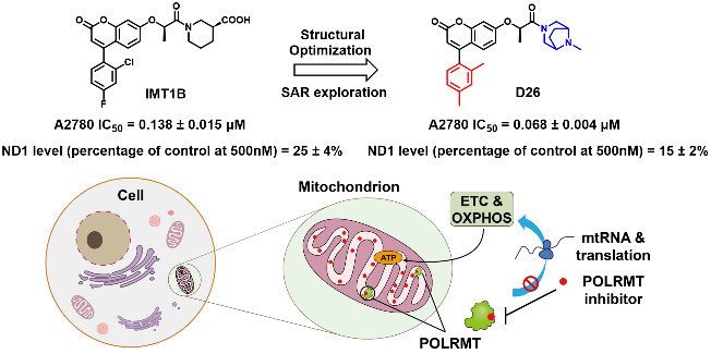 团队以Nature上发表的首个POLRMT抑制剂IMT1B为先导物,采用基于配体结构改造的策略,开展了以活性为导向的系统构效关系探究,发现了一个强效化合物D22,进一步优化其PK研究得到优选化合物D26。化合物D26可剂量依赖性地下调A2780细胞线粒体转录水平,且在撤药后能较快恢复转录水平,表明D26对线粒体转录的抑制为一种药物依赖性且可逆的过程。并且,化合物D26在高浓度下对正常细胞无明显细胞毒作用。动物实验显示,口服给药化合物D26显著抑制A2780异种移植瘤的生长,药效优于IMT1B。此前研究显示IMT1B在长期体内给药后会轻微抑制肝细胞线粒体转录,而D26克服了IMT1B这一缺陷,只对肿瘤组织线粒体转录产生影响,对心肌与肝脏组织线粒体转录无影响。因此,相较先导化合物IMT1B,化合物D26具有更优的药效与更好的安全性。优选化合物D26具有作为新型抗肿瘤候选药物进一步开发的潜力,该研究为POLRMT抑制剂的开发提供了的新思路与参考。