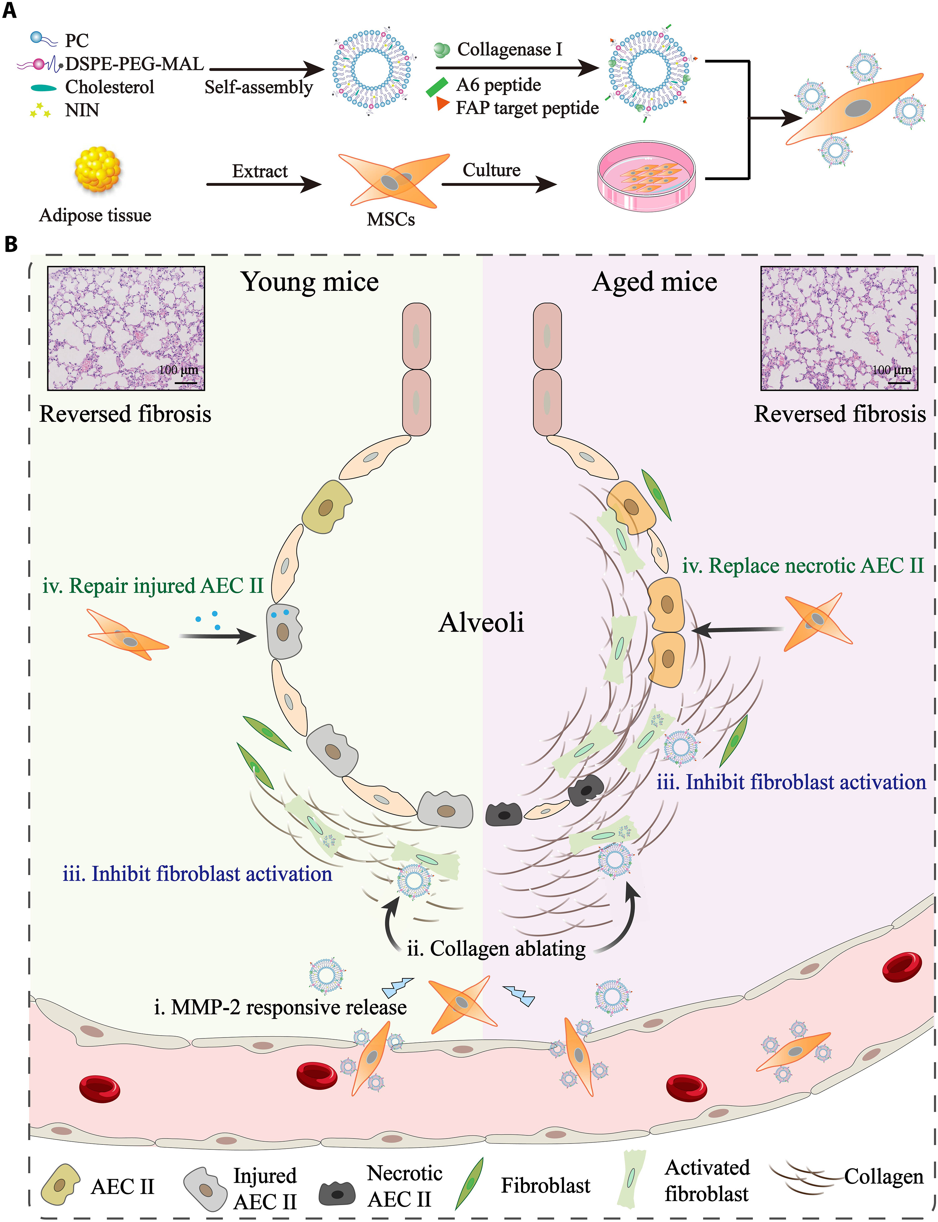 肺纤维化(PF)是一种与年龄相关的间质性肺疾病,中位生存期仅为2-4年。在疾病发生过程中,II型肺泡上皮细胞(AEC II)的持续损伤诱发成纤维细胞过度活化和细胞外基质(ECM)过度积累。姜虎林教授团队前期制备双药负载的聚合物胶束(PER NPs)黏附在单核细胞衍生的多能细胞(MOMC)上形成MOMC/PER,在年轻小鼠中表现出优异的抗纤维化疗效,相关成果发表于Sci Adv(2020,6:eaba3167)。随着研究的深入,针对受损的实质细胞,利用再生能力更佳、安全性良好的间充质干细胞(MSCs)构建MSCs杂化球体以增强组织的再生,相关成果发表于Sci Adv(2022,8:eabn8614)。然而,PF是一种典型的年龄相关疾病,中位诊断年龄为66岁,由于广泛坏死的AEC II和纤维化肺内致密的ECM沉积,老年患者的纤维化难以治愈。针对该问题,姜虎林教授团队构建一种基于MSCs的纳米工程平台(MSCs-Lip@NCAF),通过生物黏附的方式将MSCs与装载尼达尼布的I型胶原酶修饰脂质体进行偶联来治疗严重纤维化。