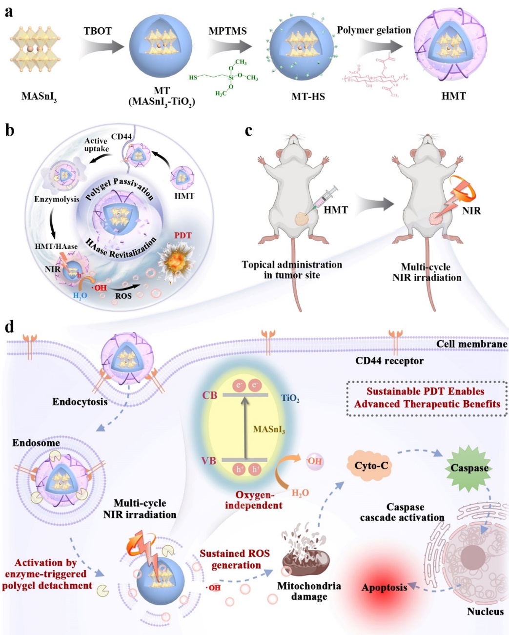 光动力疗法(PDT)是高效消除肿瘤的治疗策略,但其组织氧分压依赖性高,在乏氧肿瘤中疗效严重受限,因此开发非氧依赖型光敏剂是PDT用于乏氧肿瘤治疗的关键。钙钛矿以其超高光催化效率在PDT中极具潜力,但固有易水解、安全性差等性质缺陷使其在生物医学中鲜有研究。本研究创新开发了三明治结构的酶敏感钙钛矿光敏剂,通过在钙钛矿表面包覆TiO2电子空穴转移介质克服水不稳定性,并于表面点击修饰酶响应聚合凝胶钝化光敏活性,促进生物稳定安全、肿瘤特异性渗透和细胞内化。本研究钙钛矿光敏剂在乏氧肿瘤局部给药后,经多轮近红外辐照实现了肿瘤的完全消除,为开发新型光动力疗法提供了新思路与新技术。