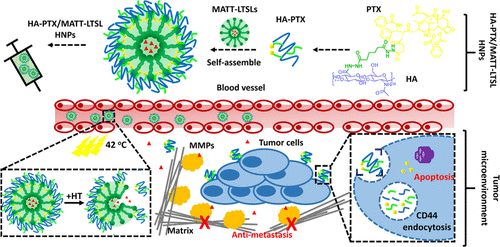 (3)The tumor microenvironment plays a critical role in tumor initiation, progression, invasion, and metastasis. Therefore, a therapy that combines chemotherapeutic drugs with a TME modulator could be a promising route for cancer treatment. This paper reports a nanoplatform self-assembled from a hyaluronic acid-paclitaxel (HA-PTX) prodrug and marimastat-loaded thermosensitive liposomes (LTSLs) (MATT-LTSLs) for the dual targeting of the TME and cancer cells. Interestingly, the prodrug HA-PTX can self-assemble on both positively and negatively charged liposomes, forming hybrid nanoparticles (HNPs). Triggered by mild hyperthermia, HA-PTX/MATT-LTSLs HNPs rapidly release their payloads into the extracellular environment, and the released HA-PTX quickly enters 4T1 cells through a CD44-HA affinity. The HNPs possess promoted tumor accumulation, exhibit deep tumor penetration, and significantly inhibit the tumor growth, metastasis, and angiogenesis. Importantly, by targeting the TME and maintaining its integrity via inhibiting the expression and activity of matrix metalloproteinases, blocking the fibroblast activation by downregulating the TGF-β1 expression and suppressing the degradation of extracellular matrix, the HNPs allow for significant metastasis inhibition. Overall, these findings indicate that a prodrug of an HA–hydrophobic-active compound and liposomes can be self-assembled into a smart nanoplatform for the dual targeting of the TME and tumor cells and efficient combined treatment.